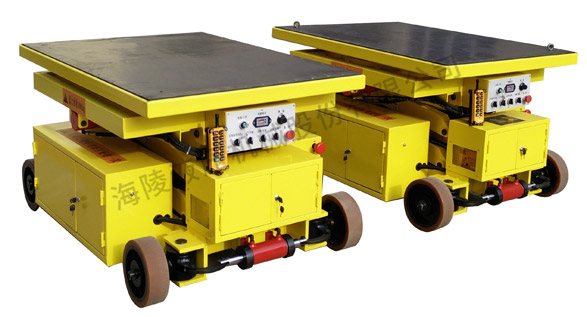 設備組成為液壓泵站驅動的升降平臺,升降平臺上工作臺面可實現(xiàn)前應移動及旋轉,整個平臺可實現(xiàn)縱橫向的行走,由電機驅動實現(xiàn)行走功能,可以自由運行,即能夠實現(xiàn)縱向、橫向。